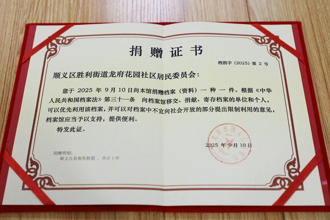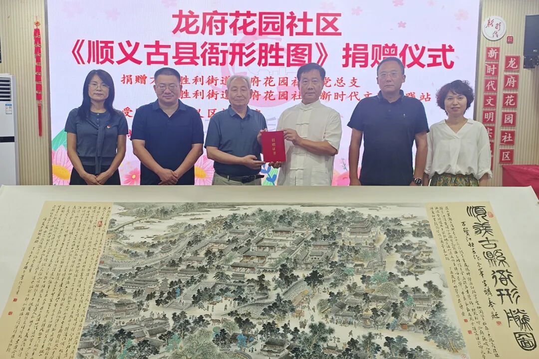 为推进历史文化资源保护传承、促进文化档案资源共建共享,胜利街道龙府花园社区向区档案馆捐赠《顺义古县衙形胜图》。捐赠仪式上,社区工作人员将《顺义古县衙形胜图》交到区档案馆工作人员手中,为“城市记忆”找到了新归宿。