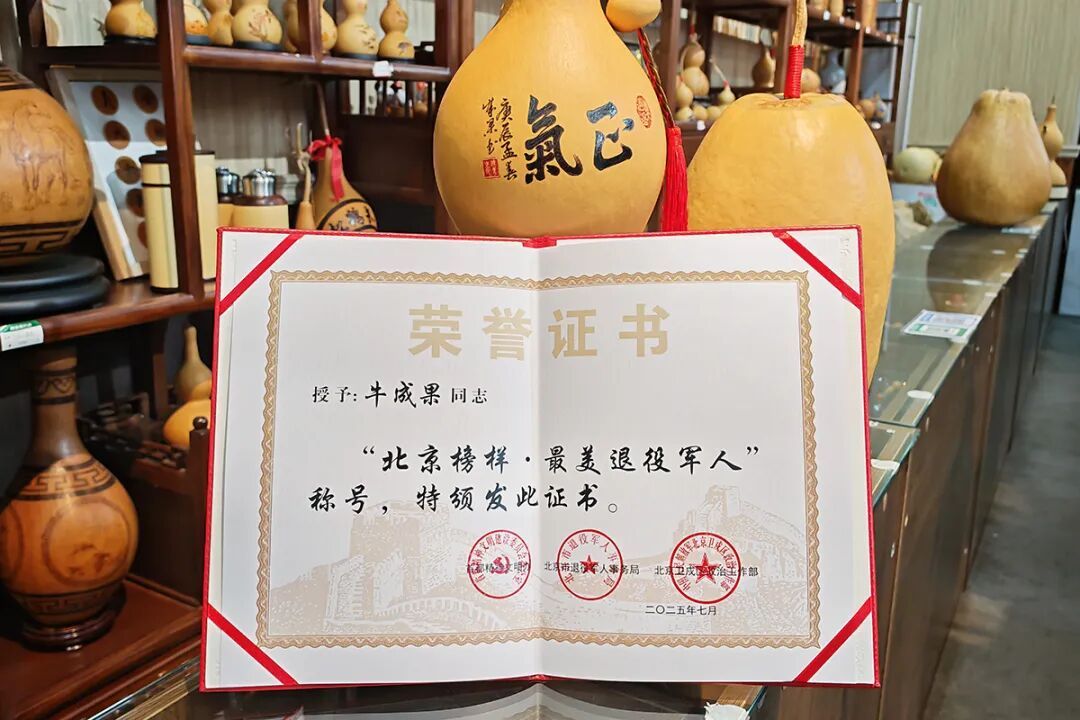 9月15日,北京市退役军人事务局联合首都文明办、北京卫戍区政治工作部发布2024—2025年度“北京榜样·最美退役军人”名单。北京吉祥八宝葫芦手工艺品产销专业合作社理事长牛成果获评2024年度“北京榜样·最美退役军人”称号。