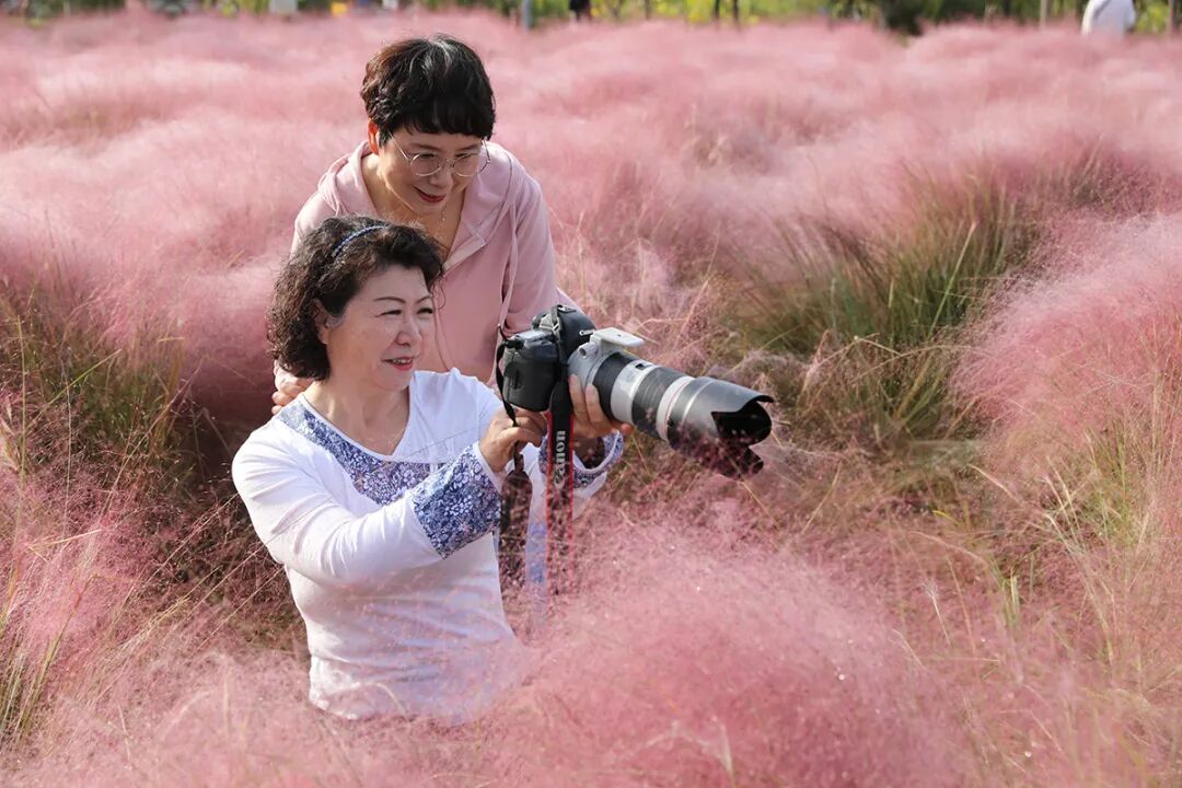 此时,公园内的粉黛乱子草也迎来盛放期。微风拂过,层层叠叠的粉色泛起涟漪,仿佛流动的云霞飘落人间。