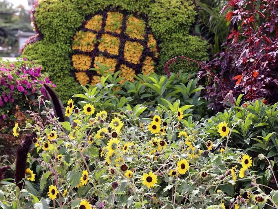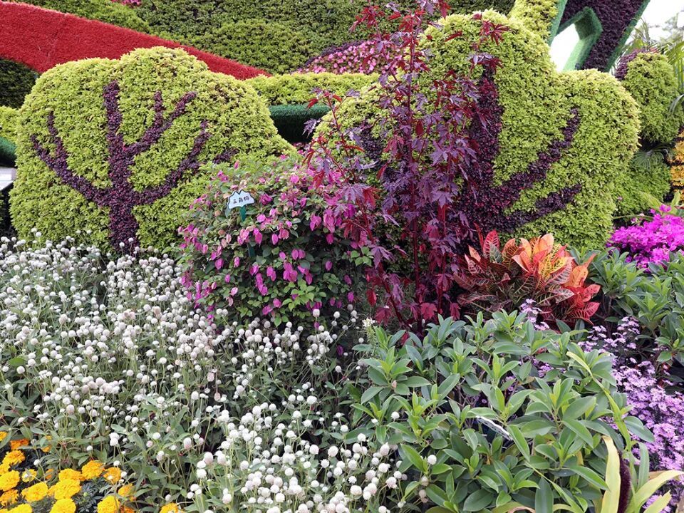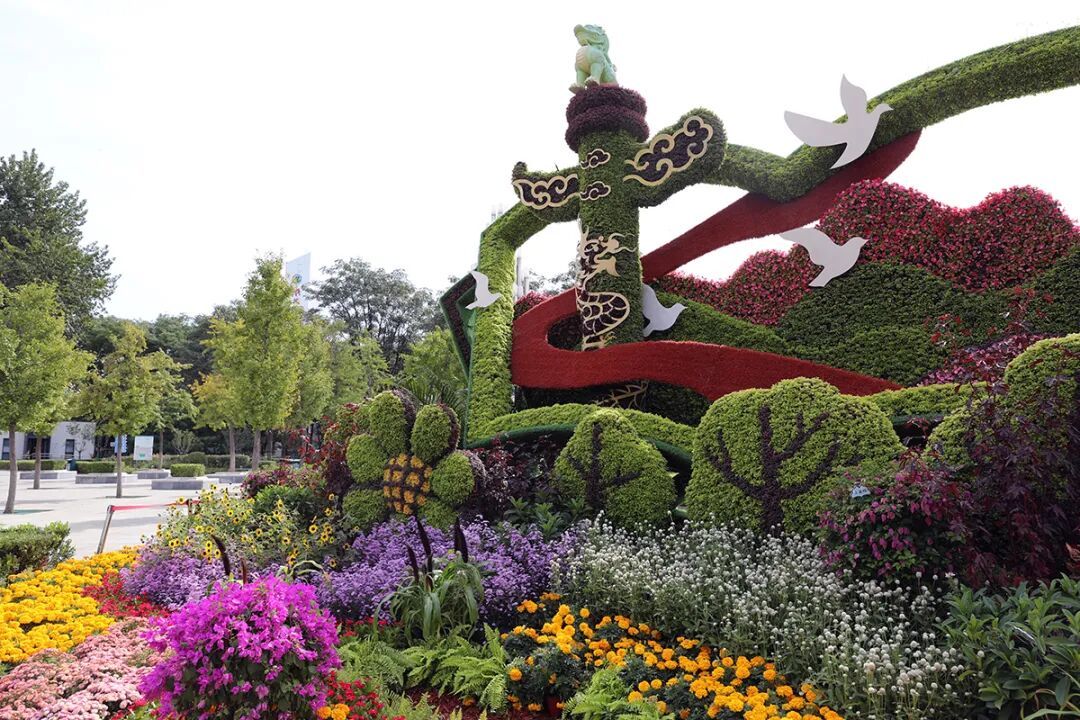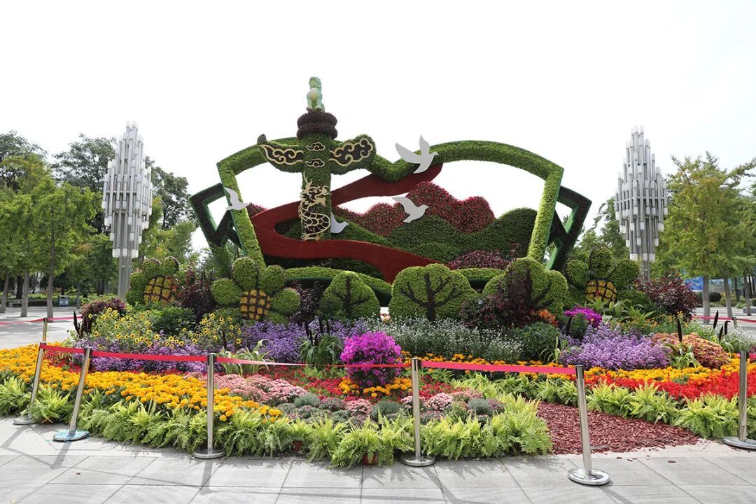 广场的“盛世华章”主题花坛更是市民争相拍照的焦点。高5米的花坛以翻开的书卷为主体,融入华表、和平鸽、红飘带等元素,搭配近10种时令花卉与观赏植物,构成了一幅绚丽多彩的画卷。