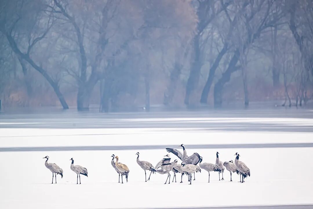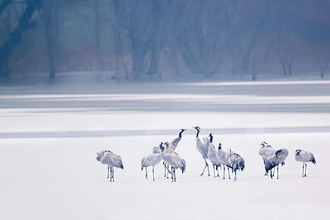 雪白的冰面上,它们或静静伫立,或低头觅食,偶尔振翅而起,在空中盘旋片刻后再次落下。修长的身姿与冬景相互映衬,构成了一幅灵动又和谐的生态画卷。