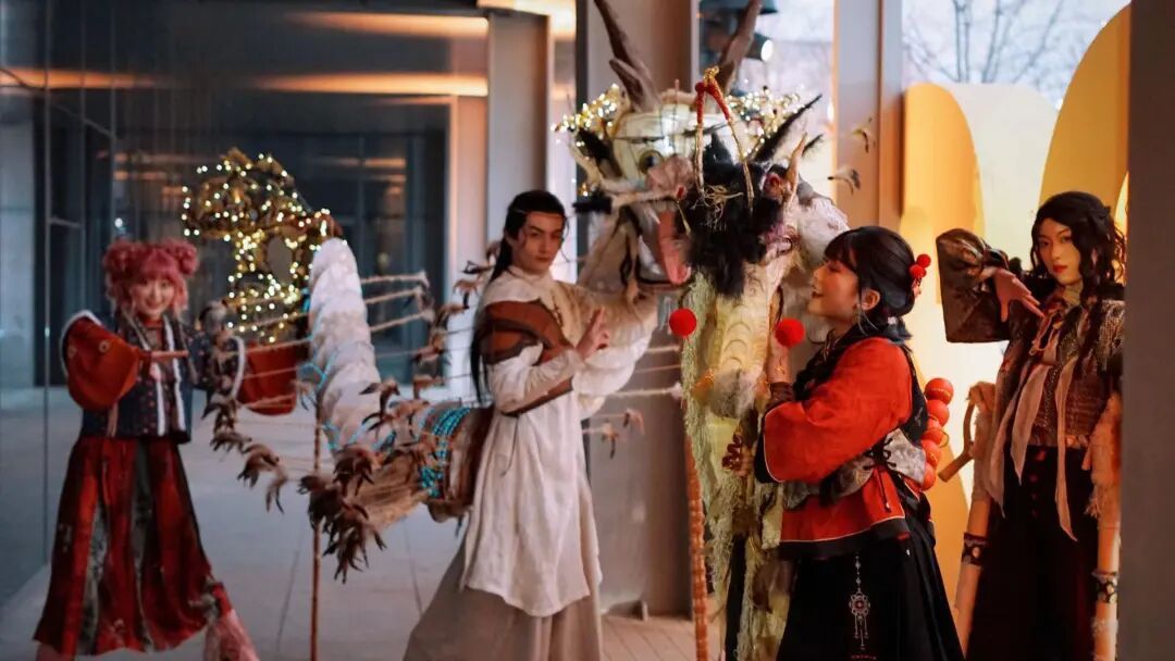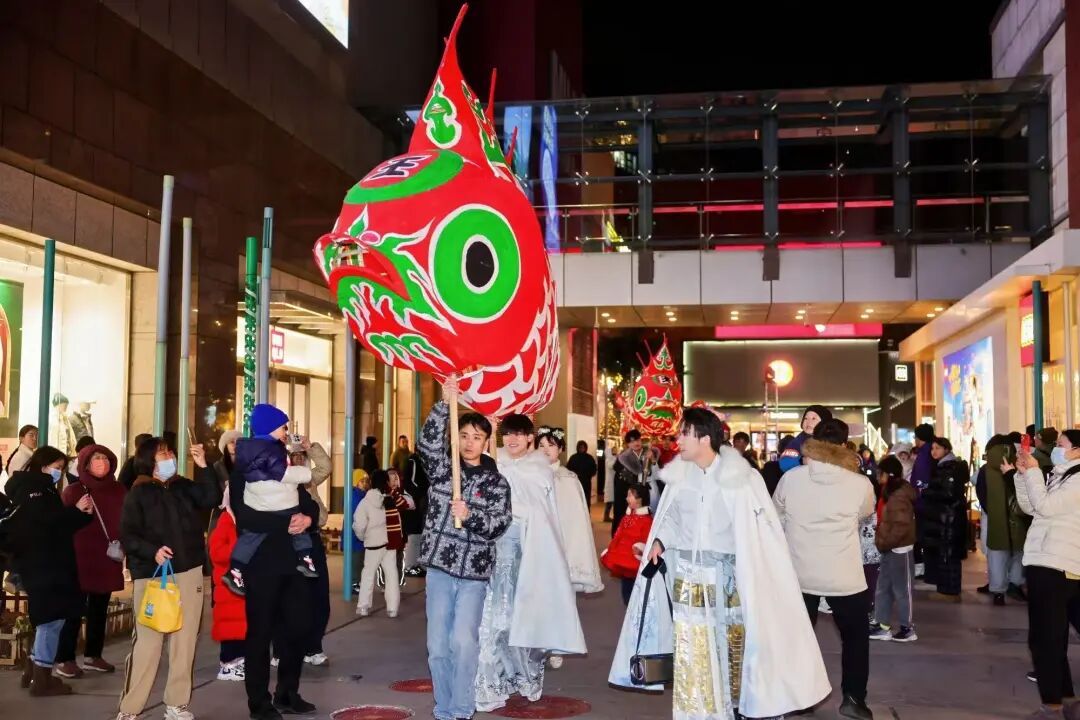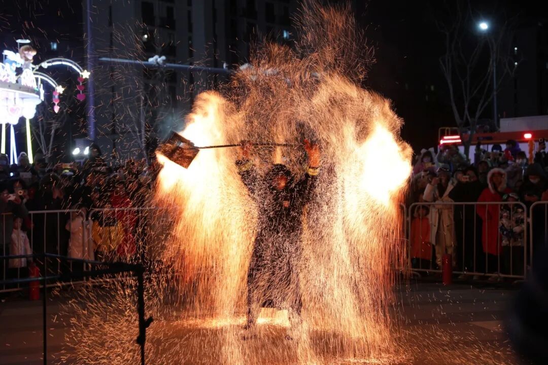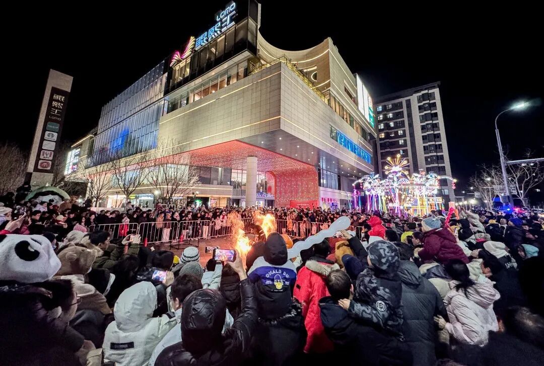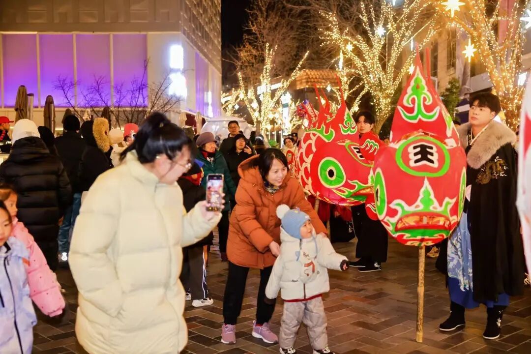 北京鲲熙汇LOMO的新年之夜,是一场精心编织的感官盛宴。18时起,商场便切换至“狂欢模式”。1号门外广场,国风火舞秀上演,舞者执火链奋力挥舞,烈焰划破黑暗,画出炫目光弧,热浪扑面而来,人群中发出一阵阵惊呼。现场设置的新年打卡点,也吸引了不少市民拍照留念。