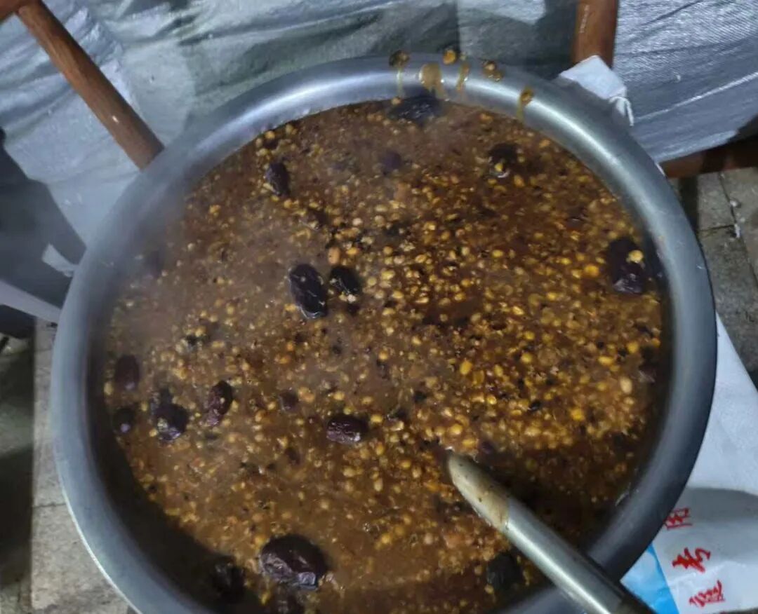 凌晨3点,孙淑文家的灯已亮起,熬粥的大锅已就位。她的朋友们陆续赶来帮忙,将浸泡了一夜的米、豆、栗子倒入锅中,香气逐渐弥漫开来。熬粥是个功夫活,需要耐心守候,还得不停搅拌,因为食材多,最怕糊锅底。几个小时的熬煮,能让各种食材的香气充分融合,弥漫整个小院。