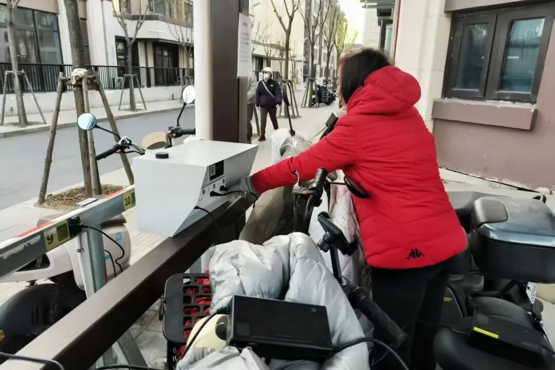双丰街道国誉府社区居民为电动自行车充电。
