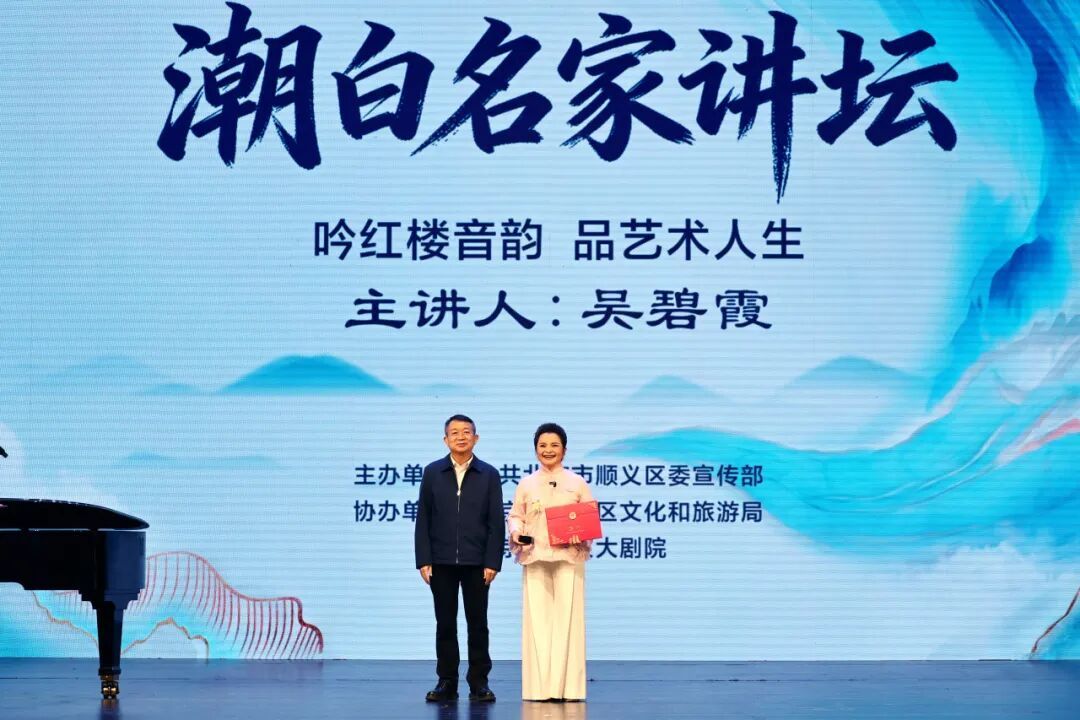 2月3日,“潮白名家讲坛”系列活动第四期在顺义区新时代文明实践中心顺义大剧院举行。本期讲坛特邀抒情花腔女高音歌唱家、中国音乐学院声乐歌剧系主任吴碧霞担任主讲嘉宾,与现场观众分享她与《红楼梦》的深厚缘分,以及多年来在艺术道路上的探索与思考。区委书记龚宗元为吴碧霞颁发“潮白名家讲坛主讲专家”聘书及奖杯,区人大常委会主任暴剑、区委副书记吴晓军出席。