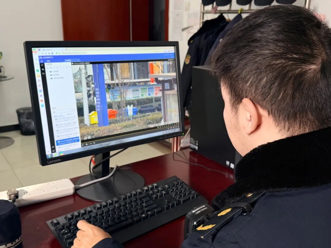 城管执法人员利用监控设备排查不规范投放行为。
