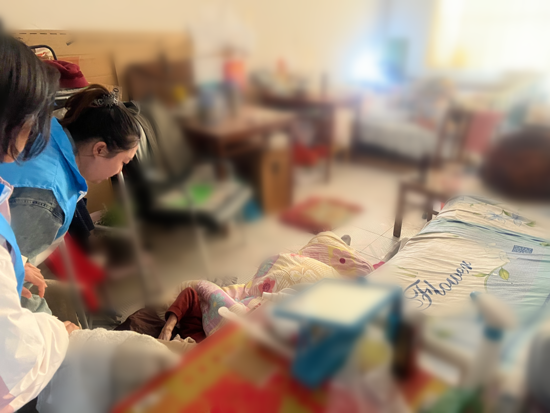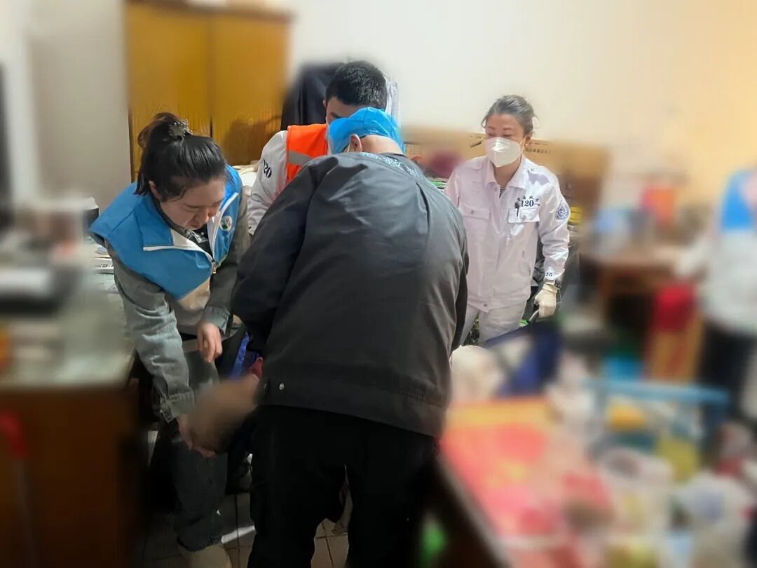 进屋后,眼前的景象让人心头一紧:万阿姨仰面倒在客厅床边,已无法自主行动。赵雪岩快步上前,轻唤并反复试探老人意识,发现老人反应微弱。情况危急,彦秋一边拨打120急救电话,一边通知老人的女儿尽快赶往医院。