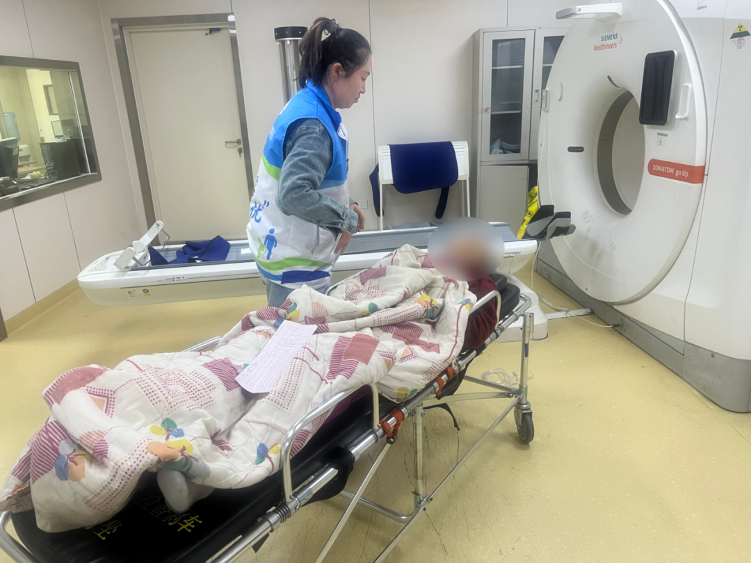 网格员彦秋陪护老人做CT检查。