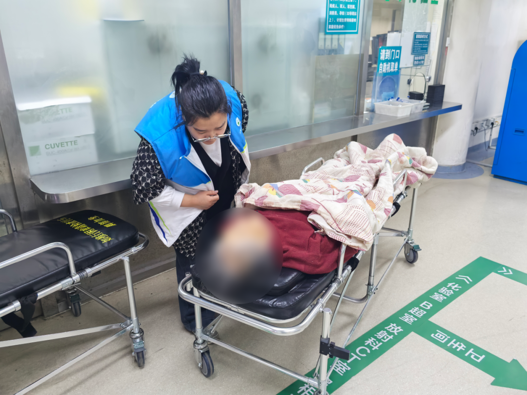 救护车抵达现场后,网格员们协助医护人员将老人抬上救护车。彦秋和赵雪岩随车护送,在医院帮忙办理挂号、缴费等手续,陪同完成检查,并耐心安抚老人,直至老人女儿赶来。