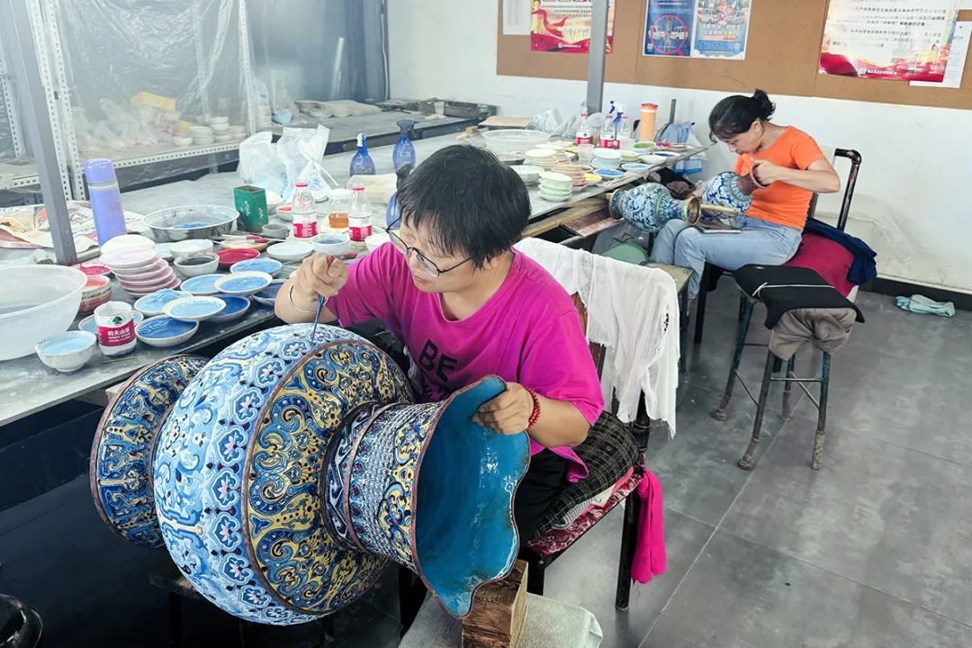 工人们进行点蓝工艺制作。