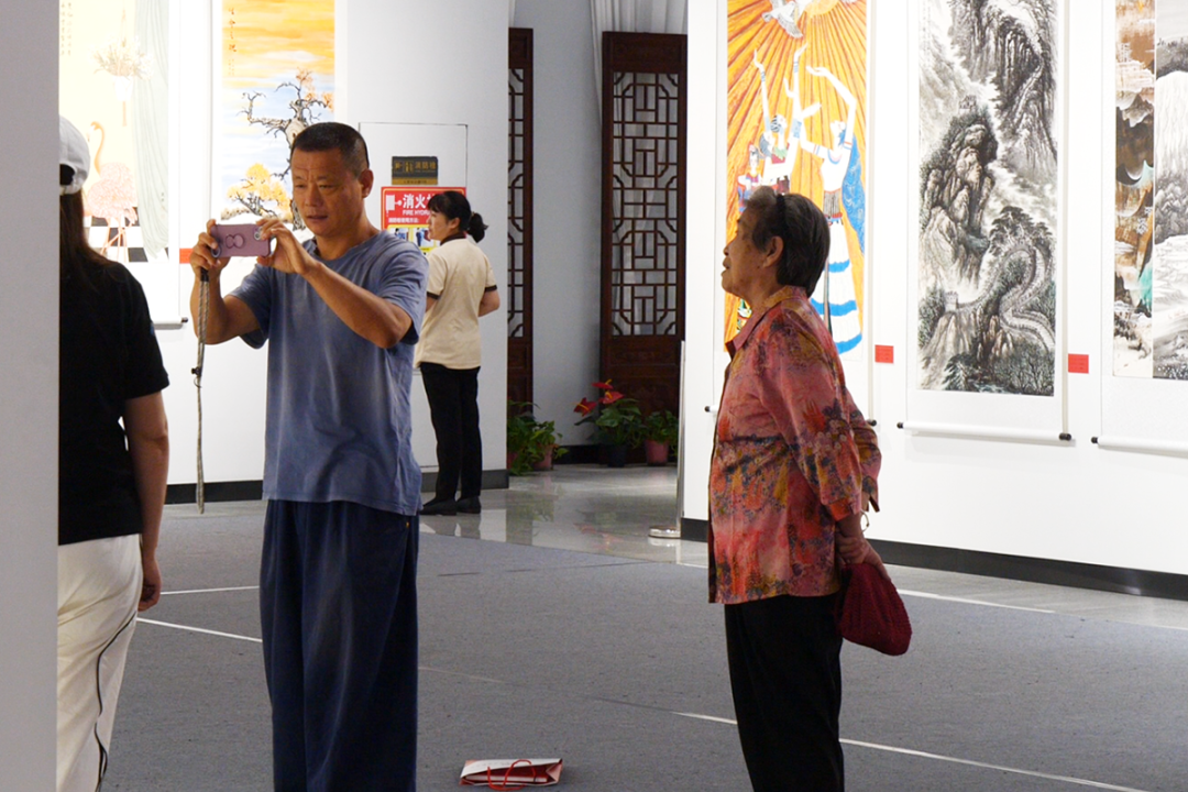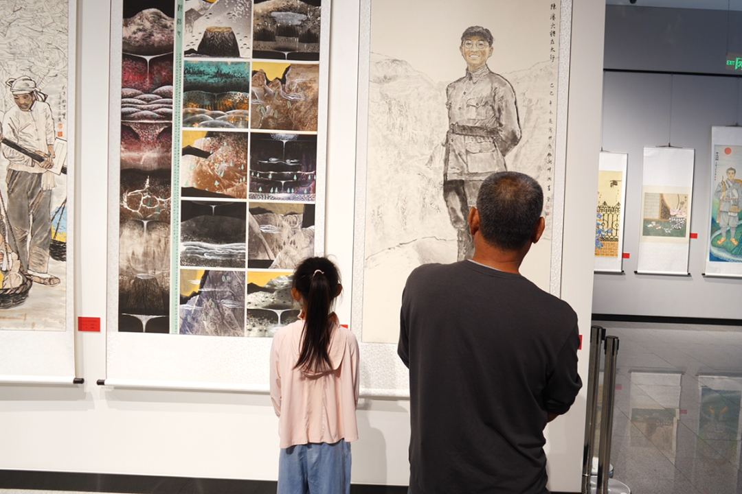 展览现场,市民或驻足欣赏,或轻声交流,神情中满是肃穆与敬意。不少市民带着孩子前来,为孩子讲述作品背后的抗战故事;还有书画爱好者凑近画作细细端详,并拿出手机拍摄记录。