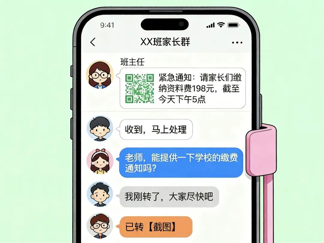初二学生姚雷(化名)在刷视频时,一名陌生男子谎称可以帮他抽取游戏皮肤,诱导其共享屏幕。过程中,对方让姚雷打开了班级群二维码并偷偷截图保存,随后扫描进入姚雷的班级群。进群后,对方将微信头像改为班主任头像,以交纳资料费为由,在班级群发送一个收款码,10余名学生家长每人通过扫码向骗子转了198元的“资料费”,事后才发现被骗。