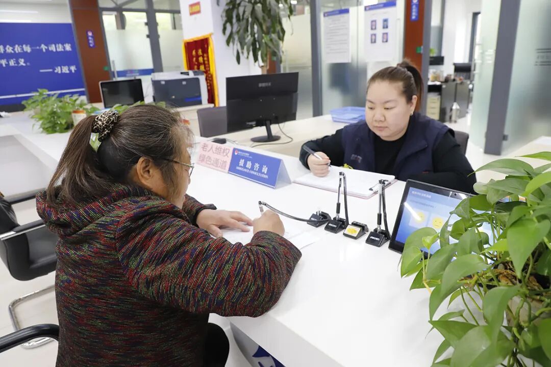 顺义区公共法律服务中心内,“老人维权绿色通道”的标志十分明显,一位老年人正在咨询赡养费相关问题,并拿起一旁的老花镜辅助填写表格,工作人员专业耐心地给予解答。