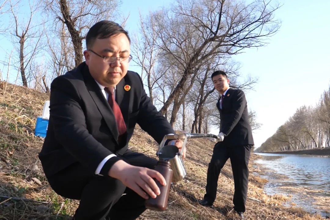 区检察院公益诉讼检察部门干警对区内河流水质进行采样。
