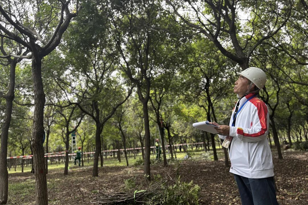 在牛栏山生态漫行步道的实操现场,栾树与海棠树成为选手们展示技艺的“模特”。他们登上梯子伸手推开枝叶,手持高枝锯,精准落刀,随后涂抹愈合剂,给树木贴上“创可贴”。一系列操作行云流水,与助手默契配合。大家严格按照“知树性、看树势、巧下剪、轻取枝、细处理、勤保护”的“六步修剪法”,整个过程既显专业功底,又藏匠心细节。