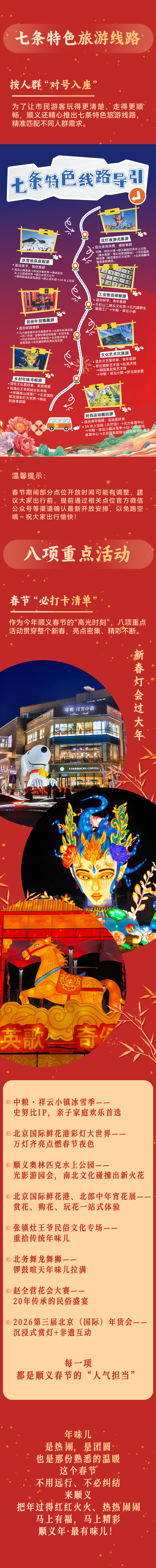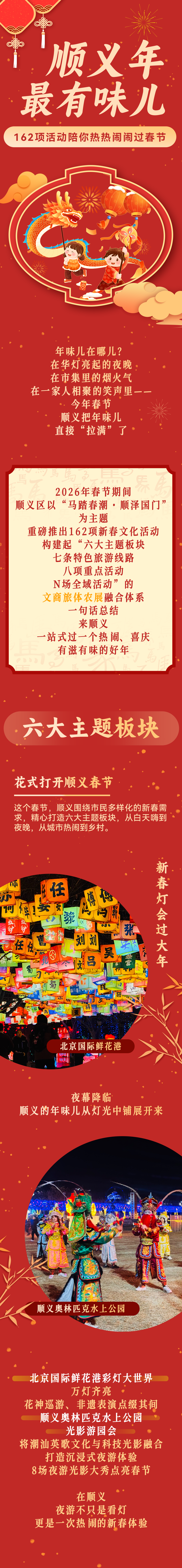 顺义年·最有味儿!162项活动陪你热热闹闹过春节 来源:北京顺义 发表时间:2026-02-14 微博 微信 QQ空间 A- A+ 打印 更多文章 在顺义过“双节”,体验感→ 致敬顺义劳动者:每滴汗水都在点亮城市 清明祭扫高峰来临,这些服务信息提前掌握 民间花会大赛热闹欢腾庆新春 又一年元宵节,愿幸福团圆 舞龙,闹元宵! 新春话年俗|辞旧岁,迎新春 新春话年俗|喜迎小年 福纳新春 新岁序开,万象更新