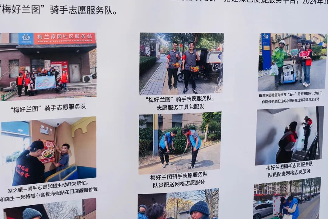 旺泉街道梅兰家园“梅好兰图”骑手志愿服务队展板。