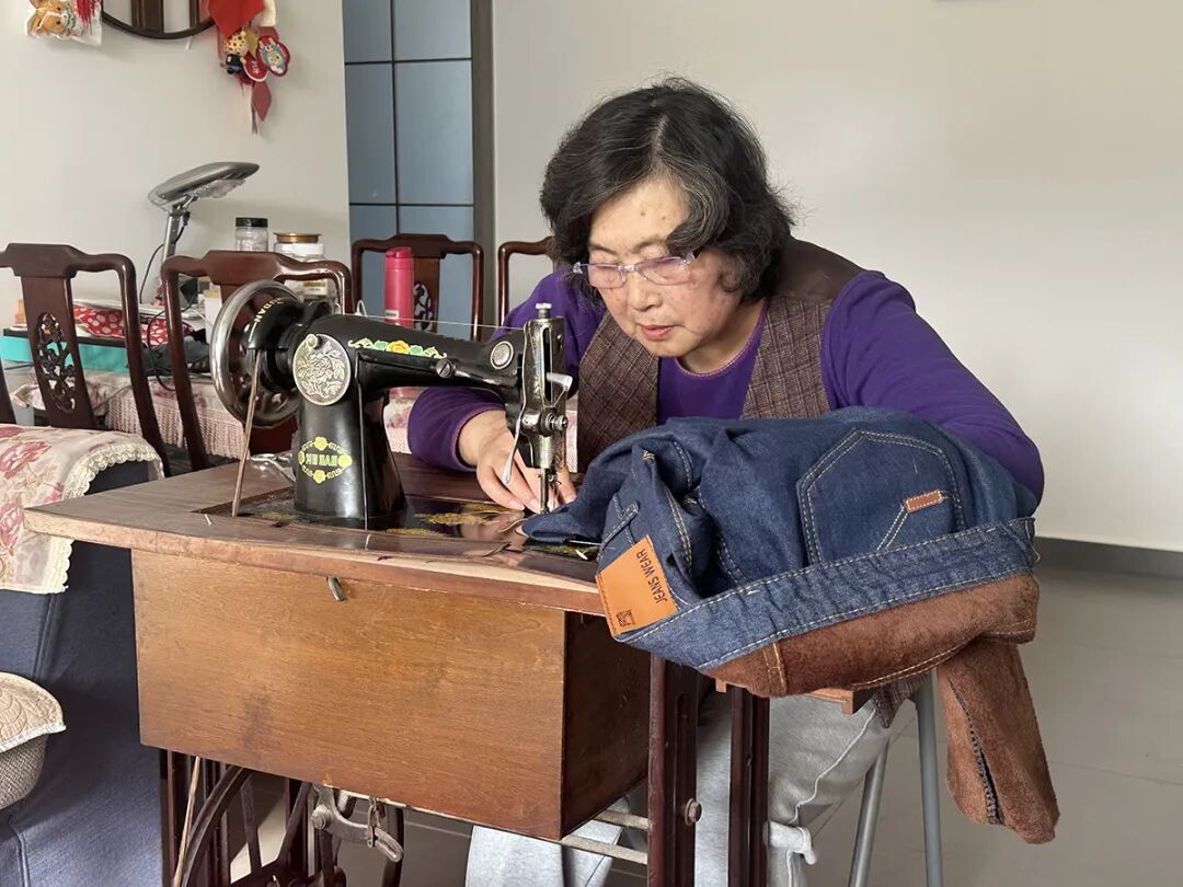 “这件是家住9层王姐的牛仔裤,长了点,裁短就行。”阎富华一边说,一边用木尺测量王丽莎需要修改的牛仔裤。剪裁完毕后,她将裤子铺展在缝纫机上,脚踩踏板,机针规律地上下跳动,压出一行匀实的针脚。待线头修剪好、裤子熨烫平整后,阎富华拨通了王丽莎的电话:“王姐,裤子修好了,您有空来拿吧。”