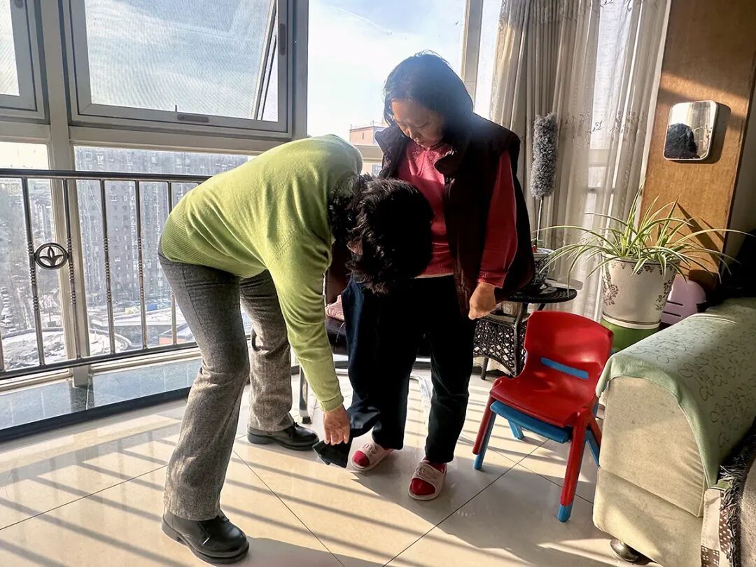 阎富华为邻居吕制萍测量裤腿长度。