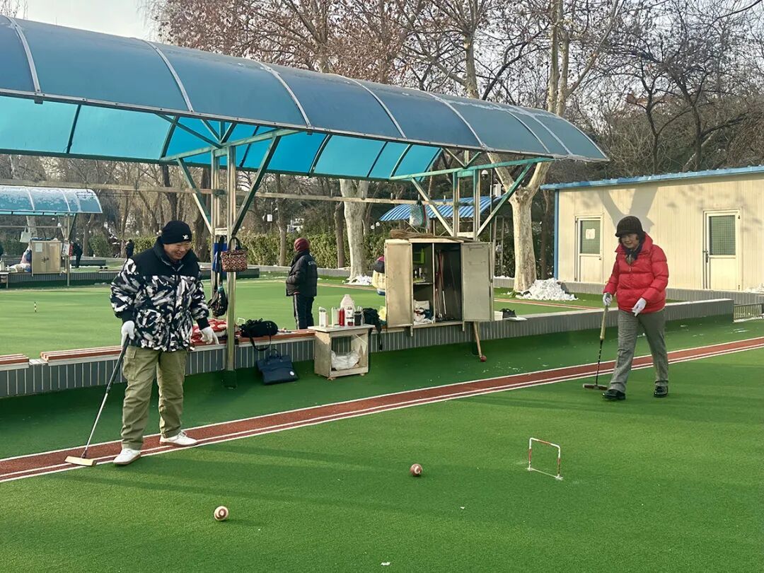 阎富华和球友夏广旭打门球。