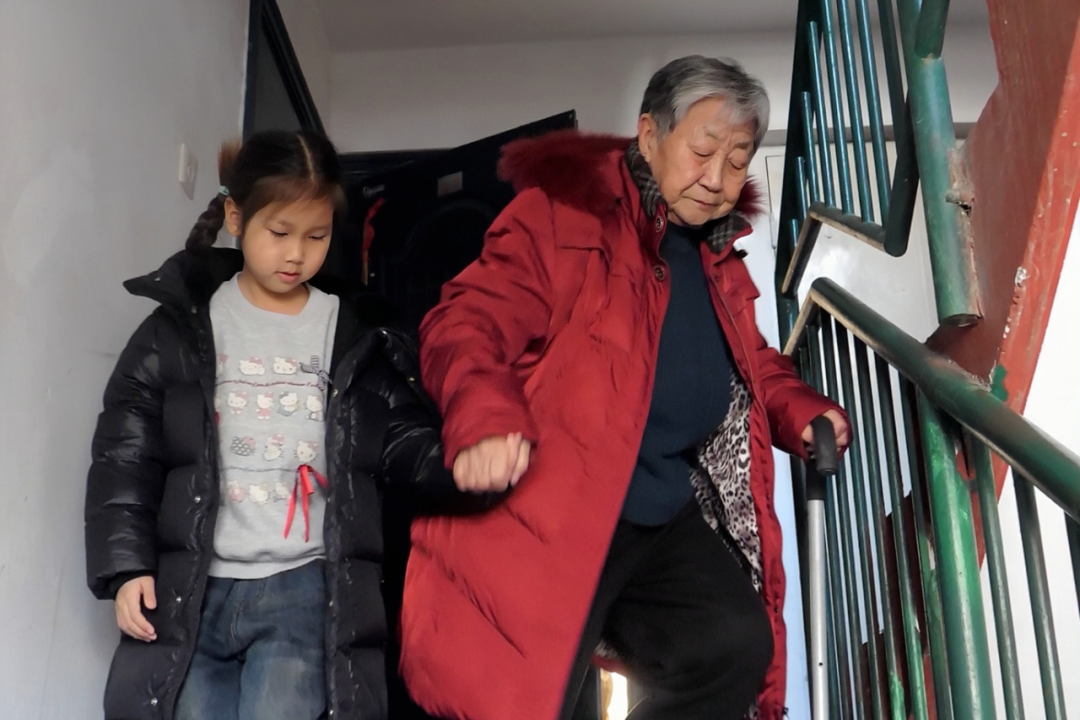 杜长玲的孙女搀扶老人下楼。