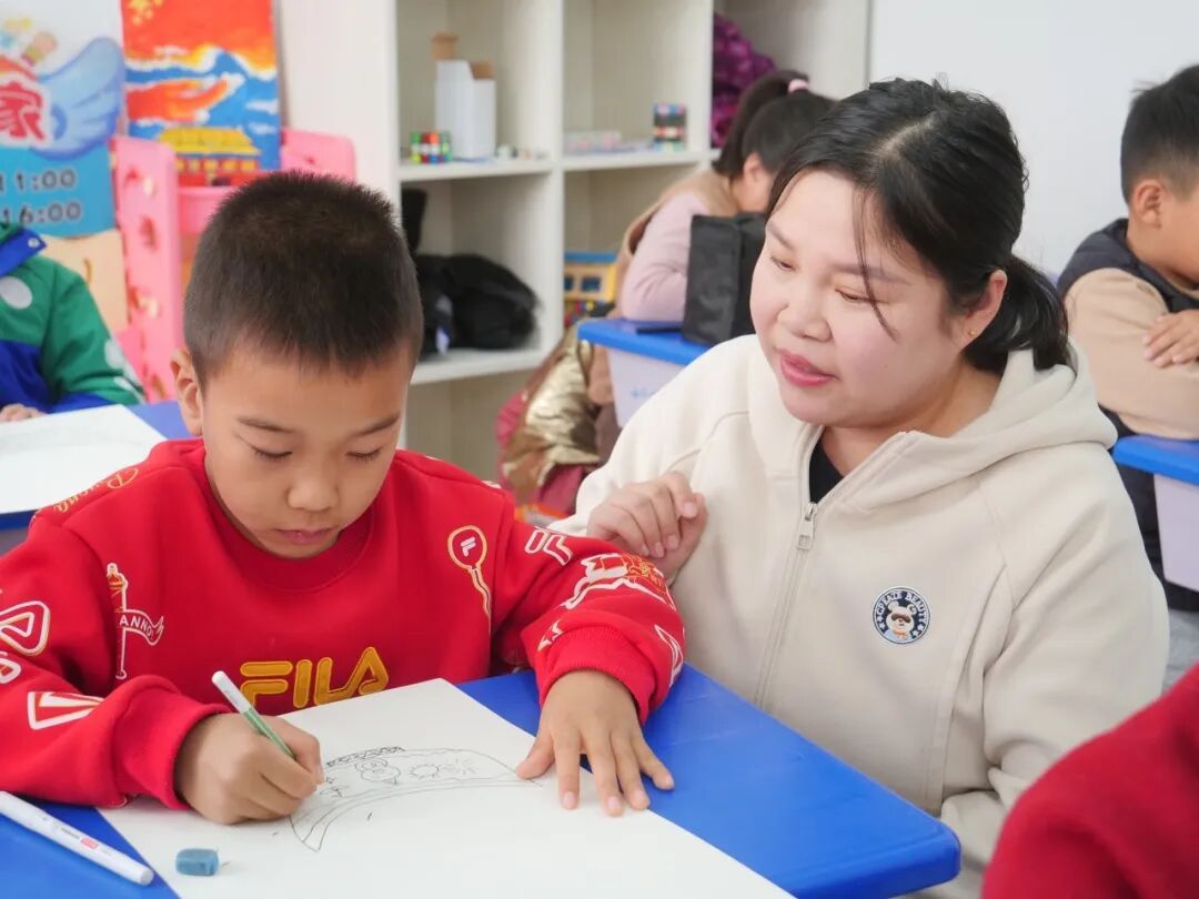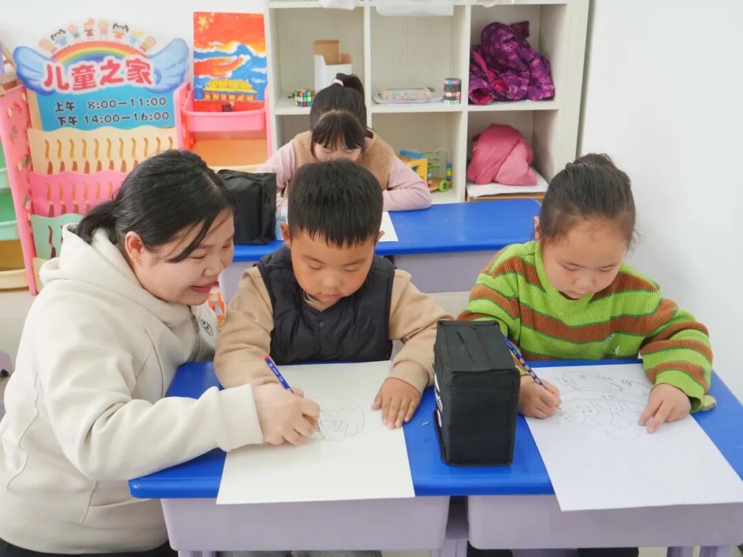 活动室里,孙雪蹲在孩子们身边,耐心地讲解绘画技巧,手把手纠正孩子们的握笔姿势,指导他们如何填色、构图。孩子们专注地听着,小手握着画笔,在纸上认真地涂画。
