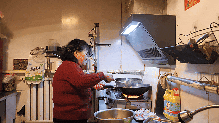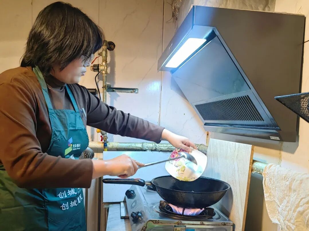 周淑兰孙女秦晓坤正在炒菜。