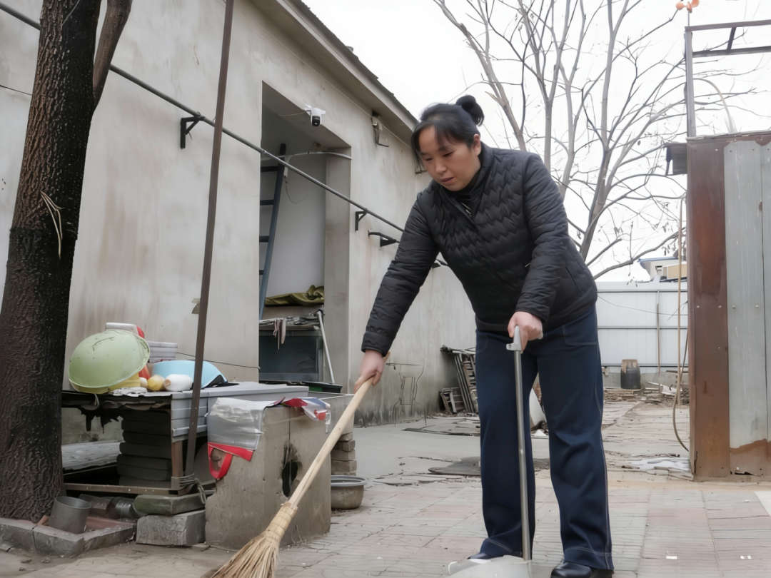 贾冬妨为老人清扫院子。