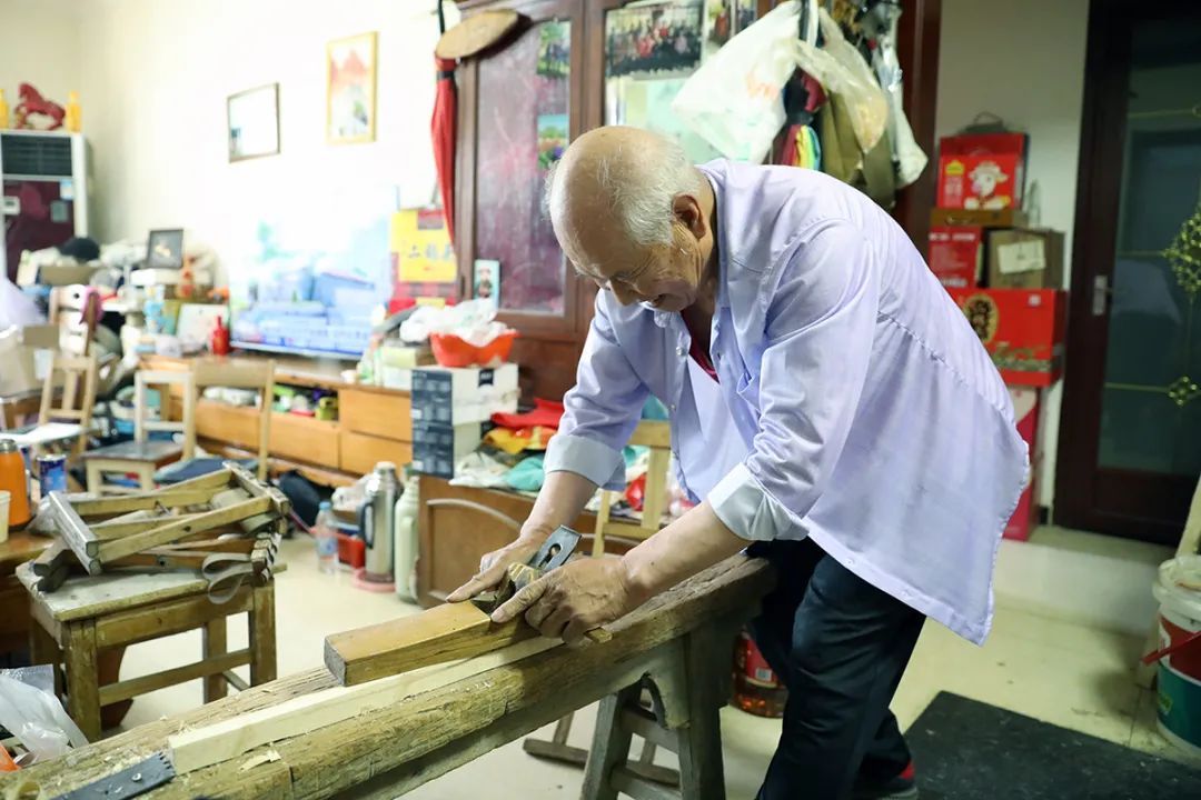 走进孙彦良的家,仿佛进入了一个小型木工作坊,屋里大部分空间被木材、工具以及邻居送来的待修物件占据。记者看到门口摆着一个黑色垫子,孙彦良笑着说:“平时我都是在这上面做小型的木活。”刨子、凿子、锯子整齐地放在盒子里,木屑的味道弥漫在空气中,每一处细节都透露着老匠人对手艺的热爱。