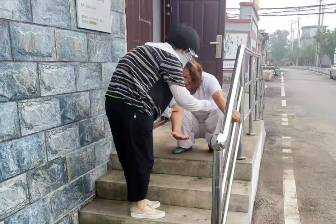 张敬砚立即小心地将当事人平放在地上,为其解开衣领通风,一边轻声呼唤,让她保持意识,一边示意黄军号:“快去叫村医!”短短几十秒,两人已默契分工,一人守着村民,将情况上报给网格长,另一人紧急求助。
