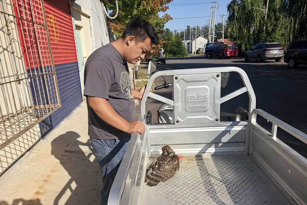 为避免老鹰因挣扎加重伤势,赵帅特意返回电动三轮车取来绳子,小心翼翼地固定住老鹰双脚,再双手捧着将它安置在车后斗。前往村委会的途中,他还多次停车查看,生怕车辆颠簸影响“伤员”状态。15时30分许,赵帅将老鹰交到了民警手中。